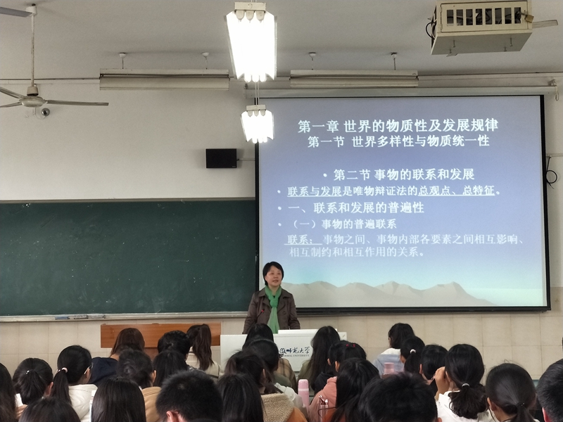 授课中,郭淑新老师首先带着同学们系统回顾了上次课所学内容即“世界多样性与物质统一性”,在条分缕析的层层递进过程中郭老师自然而然地导入新课内容“事物的联系和发展”。接着,郭老师在重点讲解“联系”这个哲学范畴的特点时,通过两个版本的故事“城门失火,殃及池鱼”深刻说明了“联系具有普遍性与条件性”,同时她运用理论联系实际的教学方式举例我国所倡导的“一带一路”建设,引导同学们用联系的观点认识我国对外开放的基本国策同世界发展之间存在的普遍联系。在解析“发展的实质是新事物的产生和旧事物的灭亡”时,郭老师特别提示同学们不能以外表的新奇断定事物,需要在历史的比较中发掘社会主义社会比资本主义社会优越的地方。在讲解“形式与内容”这对事物联系和发展的基本环节时,郭老师结合听课对象即文公司员工的专业特点具体说明要注意文学体裁与文学内容的恰当性,她娴熟地贯通思政课程与专业课程的举例使同学们感受到马克思主义哲学原理学习与专业课程学习原来这么贴近!郭老师整个授课娓娓道来、逻辑严谨、内容丰富、讲解清晰,员工们也一直沉浸在积极思考和学习的课堂氛围之中。