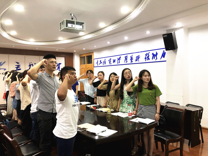 本次会议由组织委员胡雪莲主持。会议之初,首先对“政治生日”这一概念进行普及,指出我们的“自然生日”是父母给的,教会我们对生命要珍惜;而“政治生日”是党给予的,教会我们要坚定信仰。作为一位已有六年党龄的党员,齐旭旺同志表示,这是他第一次过政治生日。入党以来,他深刻认识到“入党不仅是一种荣耀,更是一种责任、使命和担当”,要做到精神上不缺钙,工作上脚踏实地,始终保持严谨、求实、勤勉的作风。而作为2015年6月30日入党的金孙磊同志表示,这是他入党第四年的第一天,今后仍要坚持“笨鸟先飞”、“滴水石穿”的精神,立足实践,全心全意为老师和同学服务。会后,支部为上半年入党的十位党员同志发放了“政治生日贺卡”,希望能够激励大家牢记党的宗旨,永葆党员先进性。组织上入党一生一次,思想上入党一生一世。为牢记入党初心,在支部书记李晨冉的带领下,全体党员佩戴党员党徽,举起右手、握紧拳头,重温入党誓词。一句句庄严的入党誓词,字字铿锵有力,句句激昂慷慨,激发了每位共产党员的自豪感与责任感。