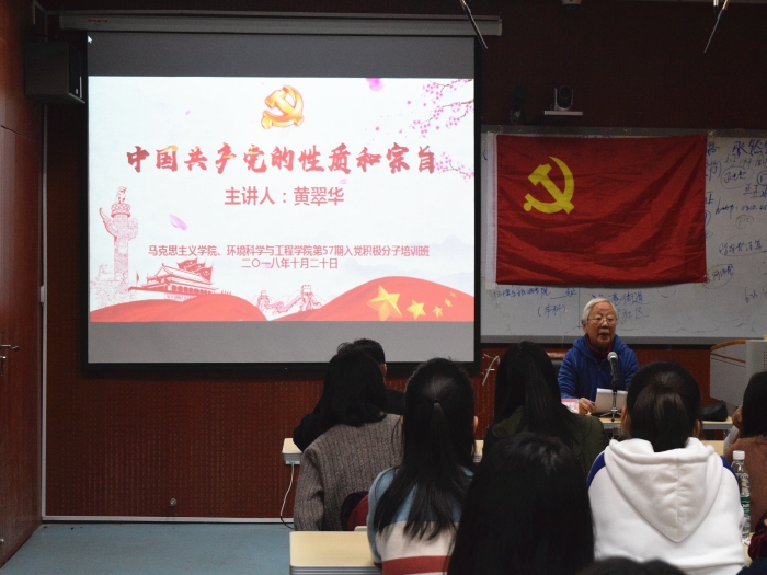首先,黄老师结合自己的人生经历为同学们讲述了她24年入党历程。在她的学习生涯中,不仅努力学习,出色的完成各项任务,表现突出,还积极上进、严格要求,在中师时期就递交了第一份入党申请书,参加入党培训。尽管之后由于时代和家庭方面的原因没能及时入党,但黄老师还是没有放弃入党的信念和激情,在递交了第三份入党申请书后,终于能够如愿的站在党旗下进行宣誓,成为一名光荣的共产党员。入党后,她始终把为共产主义奋斗作为自己坚定的理想,以实际行动践行身为党员的职责和义务。退休22年来,她从未停止过工作与学习。在回顾自己的人生历程时,她认为自己没有辜负党和人民的期望,始终为实现中华民族伟大复兴的中国梦而奋斗。同时,她给在场的所有学员提出了两点希冀:第一要常交两个朋友,图书馆和运动场,让身体和心灵都在路上;第二要怀有感恩之心、进取之心、乐观之心和包容之心,过有意义的人生。最后,针对同学们在学习、专业与工作等方面提出的问题,黄老师都给出了耐心的指导和解答,告诫大家一定要有理想有目标,并激励同学们积极向党组织靠拢,争取成为一名光荣的共产党员。