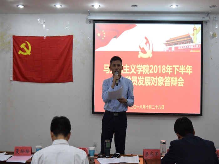 答辩会在庄严肃穆的国歌声中拉开帷幕。本次答辩会分为两个部分,分别是自我陈述和现场答题,答辩会以PPT汇报演讲的形式展开。首先,党员发展对象按照抽签顺序依次上台,从思想、学习、工作以及生活等方面汇报自己的情况,他们用生动形象的图片、极具感染力的文字向评委们表达了自己加入党组织的决心。自我陈述后,党员发展对象结合自己对于中国共产党党员的党性的理解,从党的基础理论知识、入党动机、入党后如何发挥先锋模范作用、如何实践党的宗旨以及学习、工作、生活相关问题等进行了回答,赢得了现场评委老师和同学们的阵阵掌声。本次答辩会历时三个半小时,三十一名党员发展对象完成了答辩。最后,梁齐军老师就本次答辩会做总结讲话。他充分肯定了党员发展对象们在自我陈述环节中所展现出的自信风采,传递出了正能量,也展现了beet365的精神风貌;同时他也指出了党员发展对象在现场答题时出现的问题,综合表现为时间分配不合理、对问题的理解不到位、语速的把握不准确、专业术语的表达不规范;他还鼓励入党积极分子努力学习党章,深入践行党的指导思想,争取早日加入中国共产党。