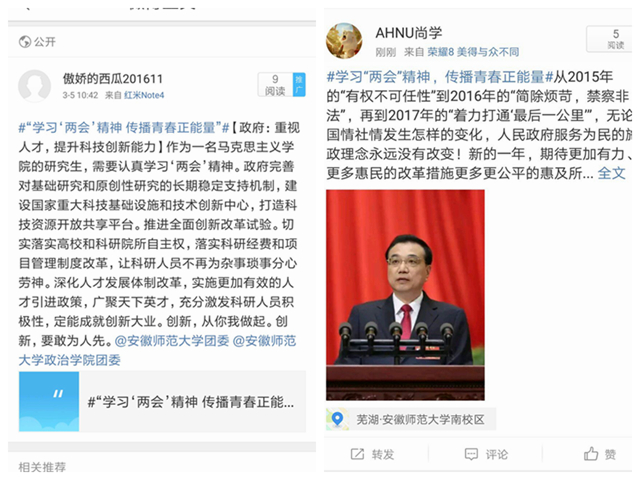 3月5日,2017年全国人民代表大会在京开幕,党支部全体党员通过网络视频收看“两会”现场直播,在微博上就自己关注的问题进行热烈讨论。党支部发起了“学习‘两会’传播青春正能量”话题讨论,各位党员积极参与充分表达自己的观点,有同学表示作为新时代的员工能感受到祖国越来越好是一种实实在在的幸福,还有同学表示能从政府工作报告中感受到作为新时代青年要敢于迎接挑战,不负时代赋予青年学习的使命。话题热度不断上升,累计浏览量达1000余次。