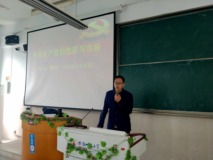 本网讯(文/吴昀 摄/叶钟昊)4月27日上午,曹明臣副教授应邀于行知楼2020403教室为第58期入党积极分子教授党课,主讲中国共产党的性质和宗旨,本次讲座由党员培训班副班主任崔东方主持。