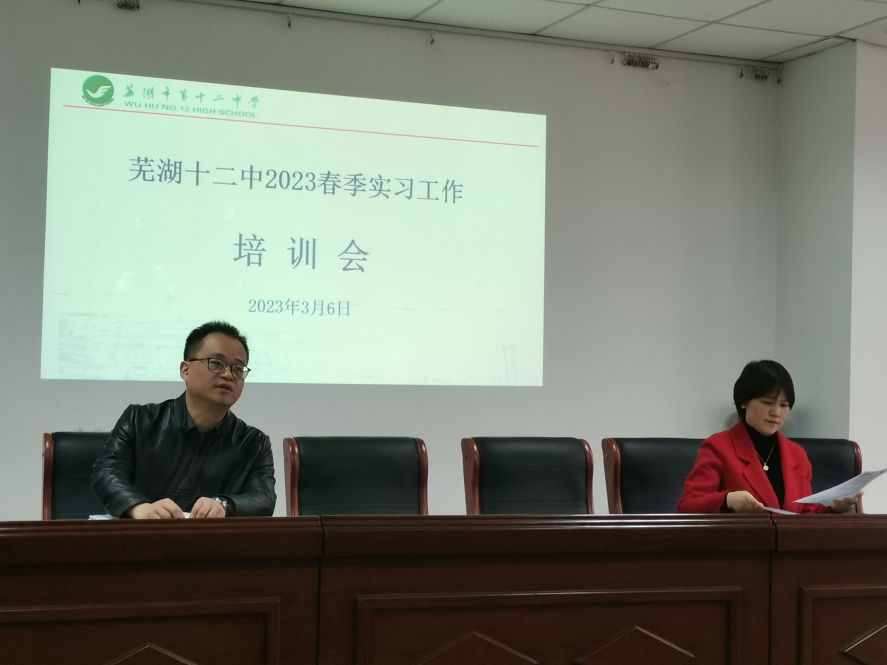 本网讯(文/李婉婷、余莹 摄/张巧)3月6日上午,在公司指导教师胡梅叶、高文娟的带领下,2020级思想政治教育专业12名本科生赴芜湖市十二中进行为期三个月的教育实习。为了帮助同学们迅速接手实习工作,适应角色转变,顺利推进教育实习进程,芜湖市十二中领导为实习生们开展了一场实习培训会。