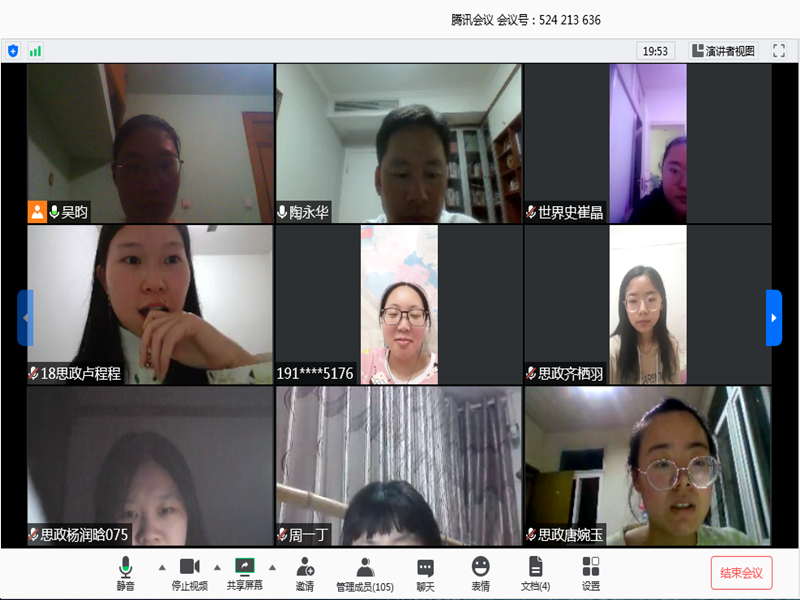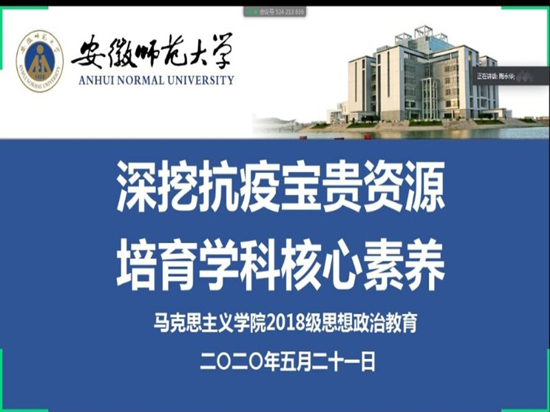 本网讯(文/摄 吴昀)“停课不停教,停课不停学。”5月21日晚,公司2018级思想政治教育专业全体员工通过网络云平台开展“深挖抗疫宝贵资源,培育学科核心素养”主题活动,此次活动由beet365教授陶永华主持,18政教全体本科生参加。