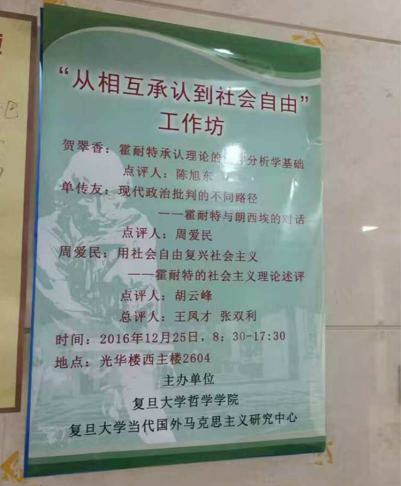 20161224日到25日,我院青年教师陈旭东副教授、单传友博士应邀赴复旦大学哲学公司参加“从相互承认到社会自由”霍耐特工作坊。该工作坊由教育部人文社科重点研究基地当代国外马克思主义研究中心举办。中心副主任张双利教授,王凤才教授主持参加了工作坊。来自中国社会科公司哲学所、同济大学beet365、华东师范大学哲学系、中国科技大学人文公司等青年学者参加了工作坊。