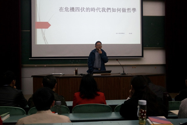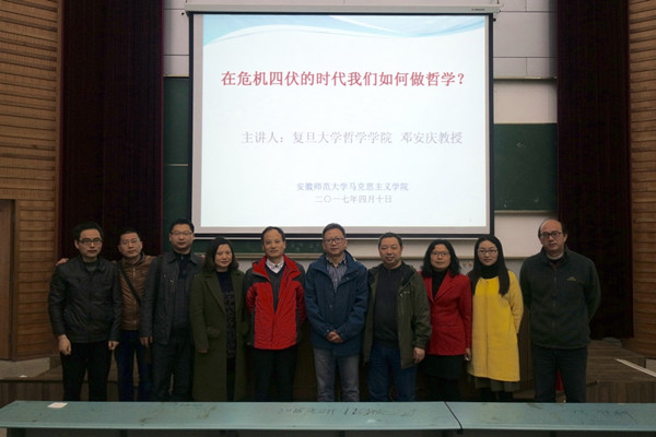 为提升同学们对于哲学的兴趣,4月10日上午,复旦大学哲学公司教授、博士生导师邓安庆教授应邀于教学楼2010105教室为公司师生作了一场题为“在危机四伏的时代我们如何做哲学”的学术讲座。讲座由公司教授委员会主任彭启福教授主持。2015级思想政治教育专业全体本科生、哲学等专业研究生、部分教师,以及文公司、历社公司的部分青年教师和研究生到场聆听了本次讲座。