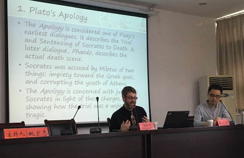 12日上午,克莱顿教授做题为“柏拉图:从《申辩篇》到《理想国》”的学术报告。报告由公司副经理姚宏志教授主持。克莱顿教授首先简要地解释了柏拉图哲学在西方哲学发展中的重要作用,接着从“谁是苏格拉底”的问题入手,详细地论述了《申辩篇》的关键主题,着重分析了苏格拉底的“无知之知”,重点剖析了哲学与爱智慧的关系以及如何看待正义与非正义的相关议题。同时,克莱顿教授还结合《斐多篇》的相关内容,进一步指出:苏格拉底之死实质上包含着柏拉图关于感性世界与超感性世界的两重区分。这种区分奠定了此后整个西方哲学发展的基本原则。