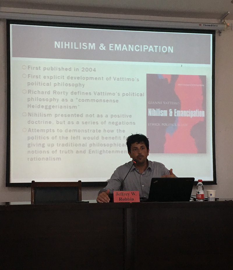 5月11日-18日,美国阿肯色州立大学克莱顿(Clayton Crockett)教授和黎巴嫩谷大学杰夫瑞(Jeffrey W. Robbin)教授,应邀到院举办题为“政治哲学:古希腊与当代”的系列学术讲座。