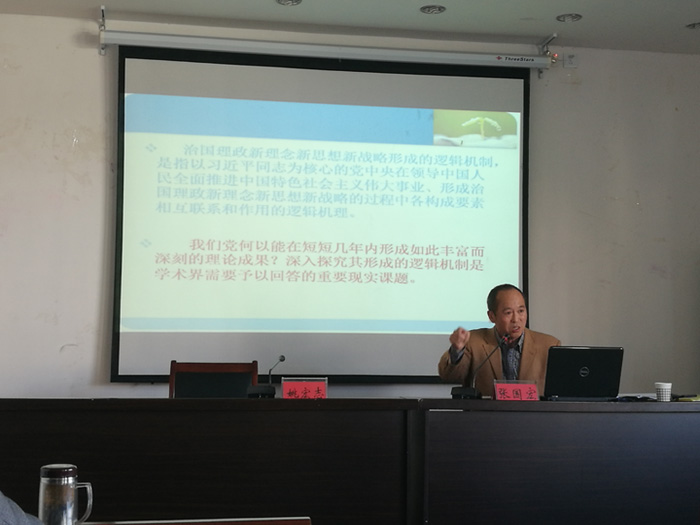 讲座伊始,张国宏教授围绕讲座主题给大家介绍了社会各界关于习近平总书记治国理政思想的多种提法,指出了“习近平谈治国理政新理念新思想新战略形成的逻辑机制”这一主题形成的学术背景。接着,张国宏教授从“逻辑主题”“理论前提”“现实依据”“历史底蕴”“文化支撑”“实践源泉”“思想主线”“价值立场”以及“个人条件”等九个方面进行了全面解读。