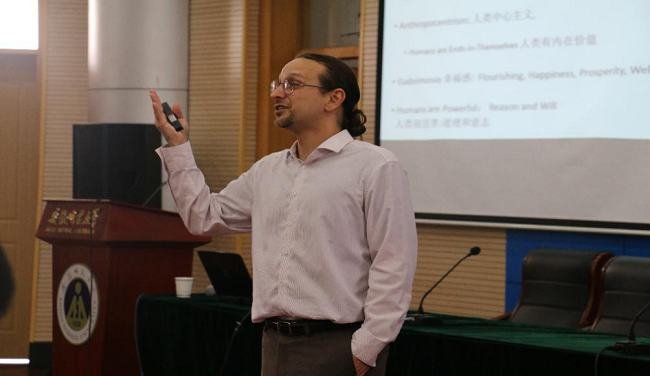 26日下午,Nick做了题为“美国环境伦理”的学术讲座,他首先从人类中心主义、人文主义、生态中心主义、自然主义和生态人文主义等相关概念出发,批判分析人类中心主义及其后果;接着,运用康德“内在价值”分析人类中心主义的历史和表现;最后,对比了中美两国关于生态文明的理论强调构建人与自然和谐相处关系的伦理价值