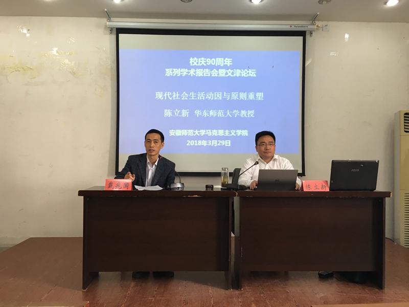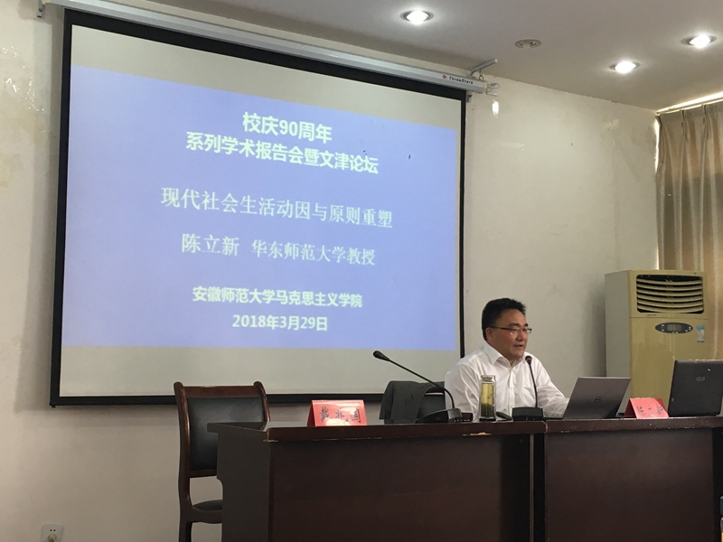 3月29日,公司杰出员工、华东师范大学哲学系主任陈立新应邀来到beet365,在校庆90周年之际为同学们带来一场名为“现代社会生活动因与原则重塑”的专题讲座。公司部分老师、研究生一起聆听了报告,讲座由科研处副处长戴兆国教授主持。