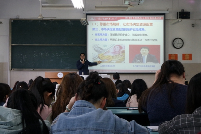 李祥兴老师围绕“中国特色社会主义经济发展的基本问题”这一主题展开本次授课内容。首先,李老师带领同学们回顾了上节课有关全面深化改革的相关知识。通过回顾全面深化改革的方向是建立社会主义市场经济体制从而引出今天的课程内容:社会主义经济体制的核心是政府与市场的关系。接着,李老师通过中西方的对比清晰揭示出在社会主义经济体制这一语境下,政府与市场关系认知的历史演进。之后,李老师通过引用林毅夫在人民日报的一篇文章来说明为什么要正确处理政府与市场之间的关系。最后,李老师结合十八届三中全会的精神和自己体会从尊重市场规律,让市场决定资源配置;加快转变政府职能,更好发挥政府作用;政府与市场协调配合,做好“和”字文章等三个方面详细解读了当下如何处理好政府与市场这一社会主义经济体制改革的核心问题。为了使同学们理解地更加透彻,李祥兴老师通过播放反腐剧的片段来强调尊重市场规律的重要性,强调要让市场决定资源配置;通过引用《审批流程“万里长征图”》来让同学们更加直观地感受到转变政府职能更好地发挥政府作用的重要性;通过对西方负面清单管理模式的阐述,来突出政府与市场协调配合的重要性。在图文并茂的幻灯片演示中,李老师清晰地解析了正确处理政府与市场之间关系的历史、现实和未来的发展方向,揭示出处理好政府与市场二者之间关系的平衡点究竟在哪这一核心问题。