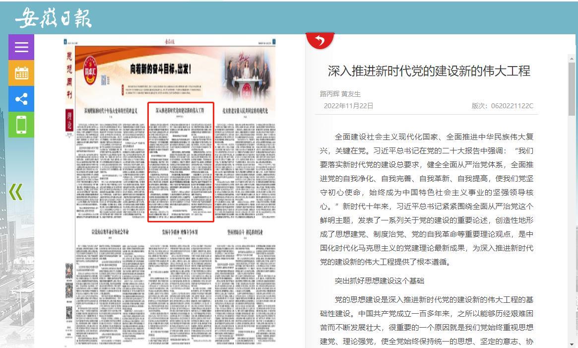 2022年11月22日,《安徽日报》第6版刊发公司路丙辉教授为第一作者撰写的理论文章《深入推进新时代党的建设新的伟大工程》。文章从“突出抓好思想建设这个基础”、“聚焦制度建设这个根本保障”、“坚持自我革命这个制胜密码”三个方面论述深入推进新时代党的建设新的伟大工程。