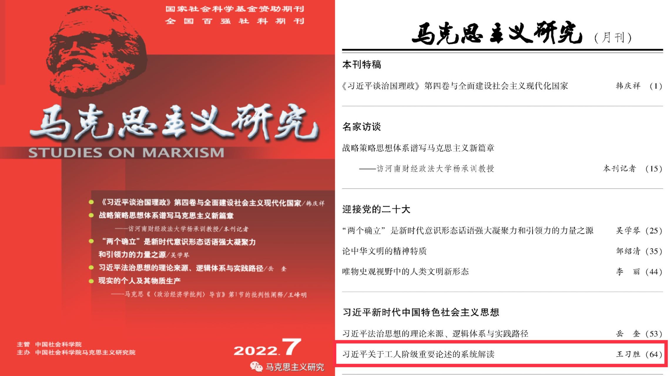 《马克思主义研究》2022年第7期习近平新时代中国特色社会主义思想版面刊发了公司教授王习胜理论文章《习近平关于工人阶级重要论述的系统解读》。文章聚焦党的十八大以来,习近平多次就工人阶级和工会工作发表重要讲话、作出的重要指示,就我国工人运动的时代主题、全心全意依靠工人阶级的根本方针、充分发挥工人阶级的主力军作用、积极推进产业工人的发展,以及弘扬劳模精神、劳动精神和工匠精神等重大理论和现实问题形成了一系列新思想新观点新要求。文章指出,这些新思想新观点新要求是推动新征程我国工人运动事业发展、团结动员亿万职工全面建设社会主义现代化国家的行动指南,是巩固中国共产党的执政基础和实现中华民族伟大复兴的战略擘画,是习近平新时代中国特色社会主义思想的重要组成部分,展现了21世纪马克思主义工人运动思想的新境界。