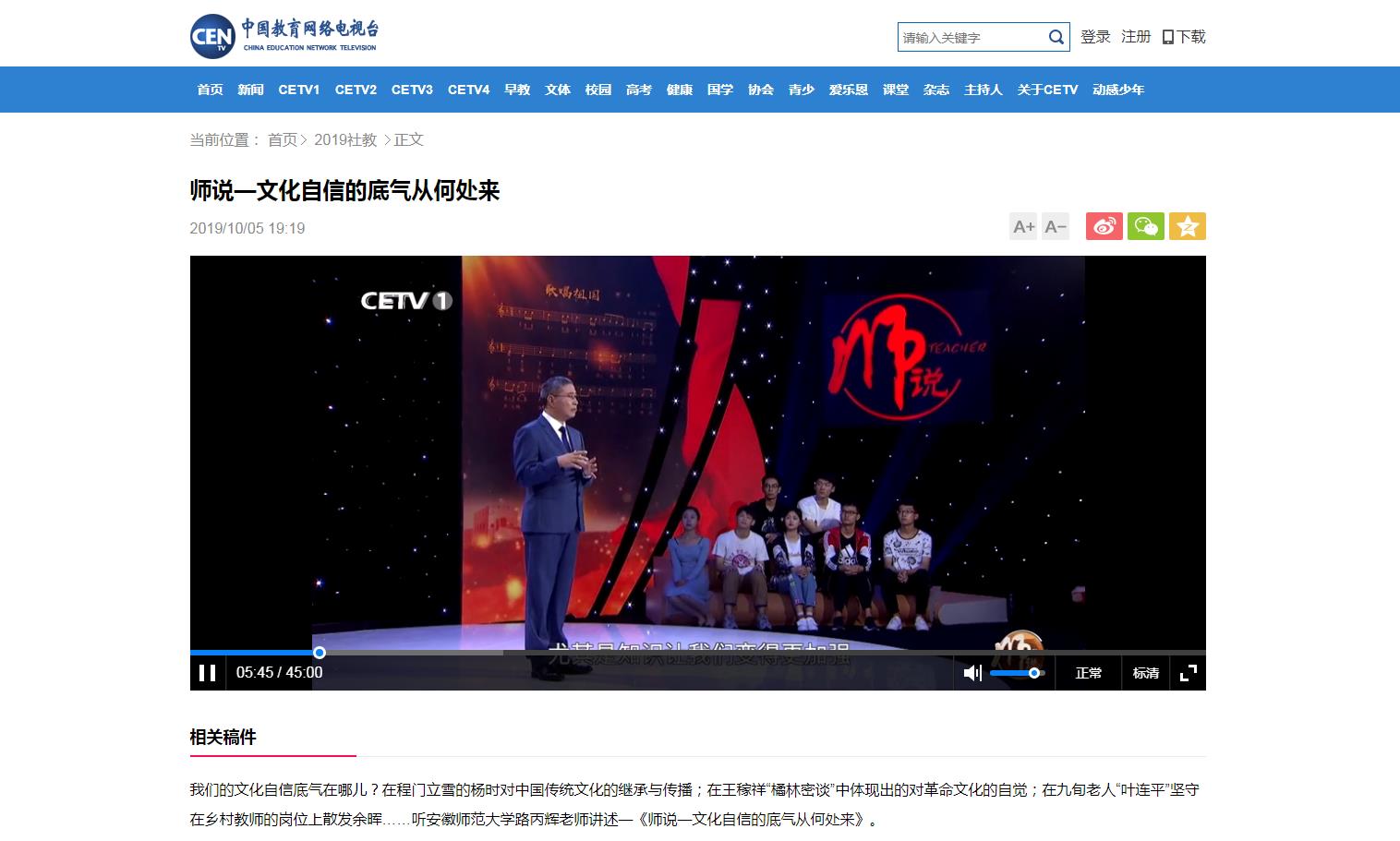10月6日,全国模范教师、全国思政课最美教师、全国师德标兵,公司路丙辉教授应邀参加中国教育电视台的《师说》第二季的节目录制,主讲题目为《师说—文化自信的底气从何处来》。