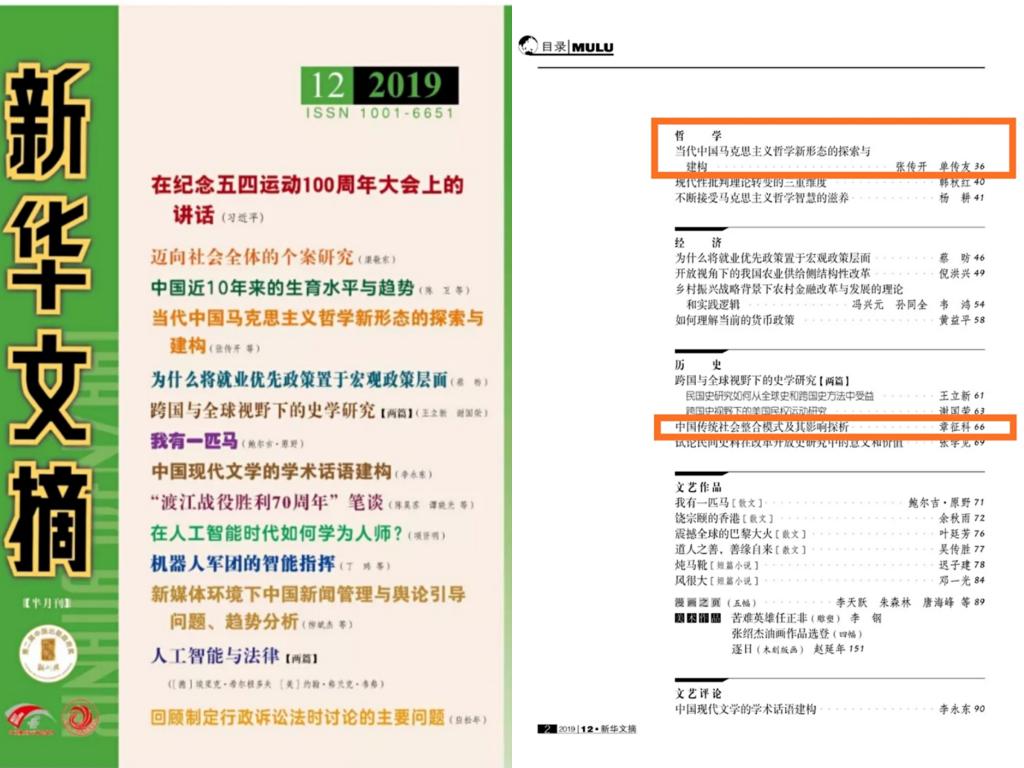 6月20日,beet365张传开教授和单传友副教授共同撰写的论文“当代中国马克思主义哲学新形态的探索与建构”,章征科教授撰写的论文“中国传统社会整合模式及其影响探析”被2019年第12期《新华文摘》全文转载。