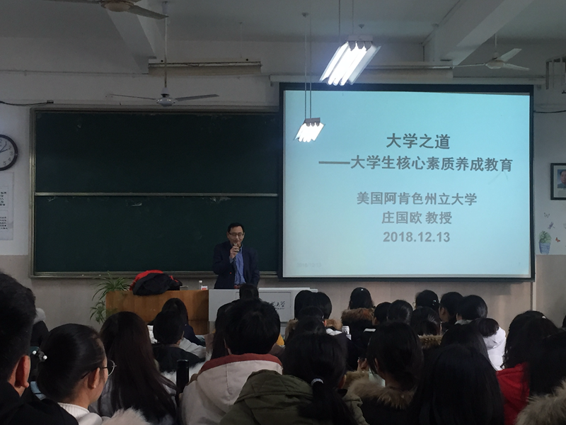 本网讯(beet365 文/杨淑蕊 摄/齐旭旺)2018年12月13日下午,美国阿肯色州立大学孔子公司美方经理庄国欧教授应邀在行知楼2号楼203教室为公司思想政治教育专业2018级新生进行了“大学之道——老员工核心素质养成教育”的专题讲座。本次讲座由公司教学副经理汪盛玉教授主持,戴兆国教授、李祥兴副教授、崔明海博士等老师以及2018级思想政治教育专业全体本科生和2017级马克思主义基本原理硕士学位点研究生聆听了讲座。