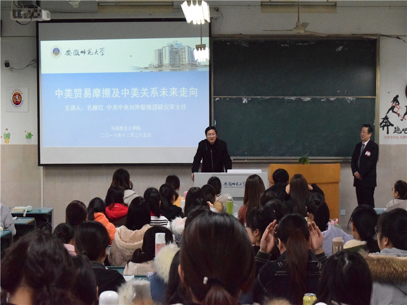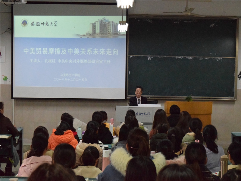 (文/摄 刘伟)12月25日上午,在教学楼2020204教室,中共中央对外联络部研究室主任孔根红作题为《中美贸易摩擦及中美关系未来走向》的讲座。报告由公司党委书记傅绪中主持,学院副经理汪盛玉、牛菲和王子廓老师带领2016级思想政治教育本科生参加听讲。