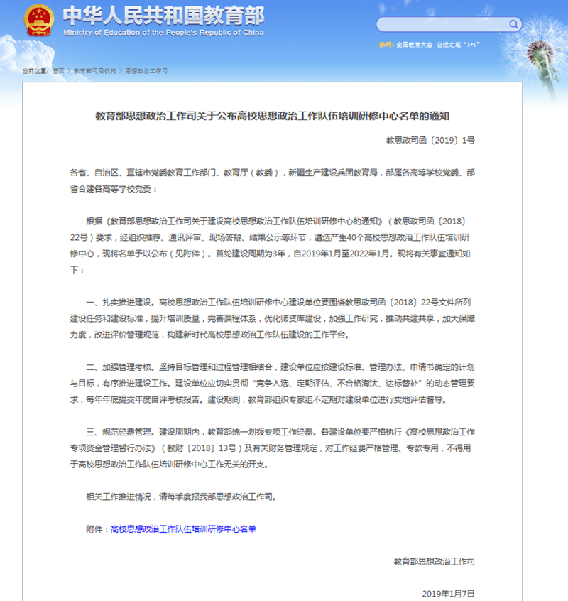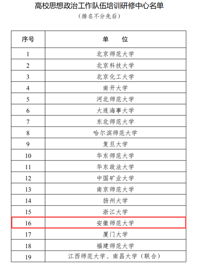 本网讯(辅导员基地 汤小宾)1月7日,教育部思想政治工作司正式发文公布40所高校思想政治工作队伍培训研修中心名单,beet365官方网站名列其中,成为全国40所高校思想政治工作队伍培训研修中心之一,也是安徽省唯一入选高校。