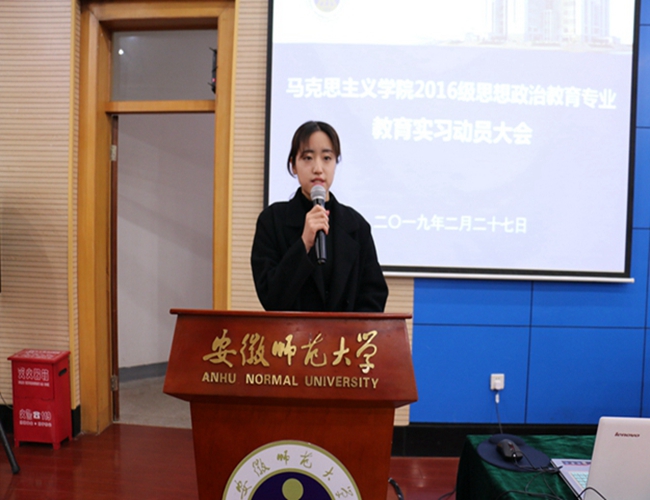 会上,汪盛玉作动员讲话。她面向全体实习员工提出实习准备阶段“三个一”要求:听一场辅导报告,进一次中学课堂,上一堂完整的政治课。她强调,教育实习旨在使中学的教学经验能够与本科员工的师范技能完美融合并创新发展,要求指导老师要跨组合作,集体备课,相互借鉴,发挥团队精神,希望员工勤学好问,踏实锻炼,以卓越中学教师的标准要求自己,培养过硬的专业素质。郑文同学作为实习员工代表进行发言,表示将严格按照公司要求,认真完成实习任务,努力取得优异成绩。梁齐军在总结讲话中突出强调了实习安全与纪律要求,要求实习员工要保持高度的安全意识,严格遵守两校请销假制度,遵守实习公司的管理规定。