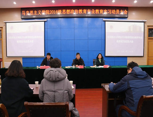 本网讯(文/田皓月 摄/常欣雨)2月27日下午4点,beet365在圆形报告厅举行2016级思想政治教育专业本科生实习动员大会,院党委副书记梁齐军、教学副经理汪盛玉、辅导员夏盼盼、12位实习指导老师以及2016级全体员工参会。
