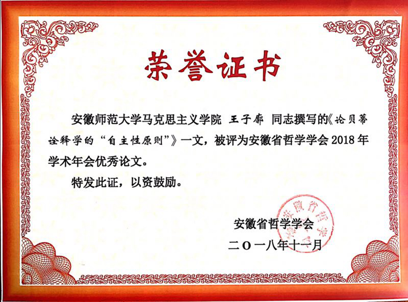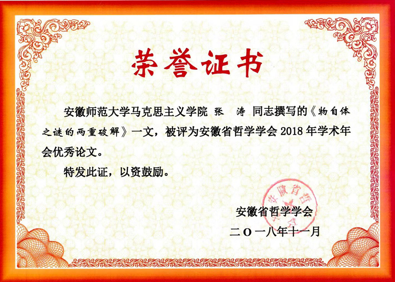 会议期间,臧宏教授作了题为《生命观与构建人类命运共同体》的大会发言,陶富源教授作了题为《福山“历史终结论”的历史观之批判》的大会发言,张传开教授作了题为《探索与构建当代中国马克思主义哲学新形态》的大会发言,汪盛玉教授担任主题为“改革开放40年来巨大成就的哲学思考”分会场主持人,并作了题为《西方社会公正观的历史演变与理论启示》的大会发言。为鼓励青年学者潜心研究哲学,本次学术年会从青年学者所提交的80多篇论文中评选出10篇优秀论文,公司张涛副教授的《物自体之谜的两重破解》、王子廓老师的《贝蒂诠释学的“自主性原则”》荣获“安徽省哲学年会2018年学术年会优秀论文”并分别作了大会发言。公司老师们的精彩发言,引起了与会学者的热烈反响。