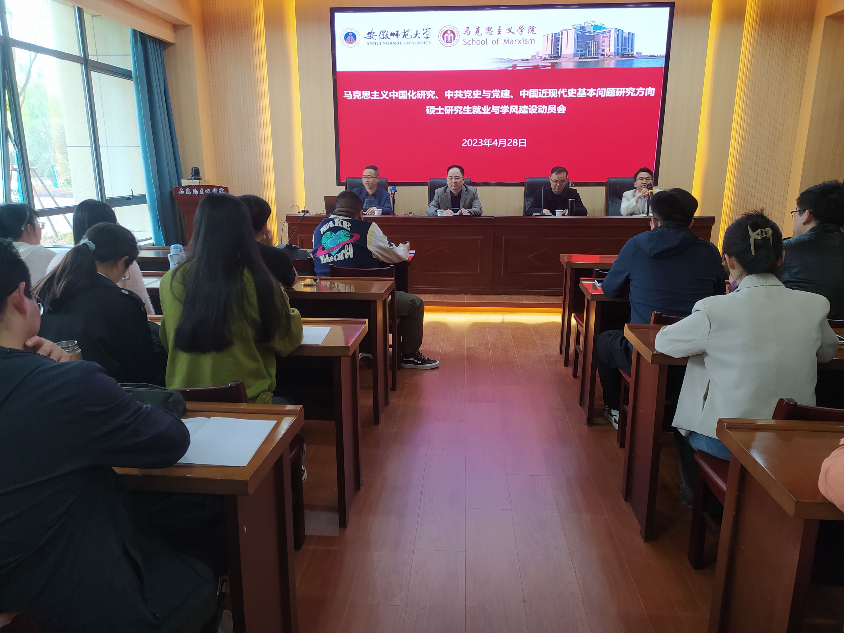 4月28日下午2点,马克思主义中国化研究、中共党史与党建、中国近现代史基本问题研究三个方向硕士学位点在beet365G106会议室召开了硕士研究生就业与学风建设动员会,会议采取线上线下相结合的方式进行。经理姚宏志教授应邀参与指导,马克思主义中国化研究硕士点负责人郭理副教授、中共党史与党建硕士点负责人孙亮副教授及全体硕士研究生参加本次大会。会议由中国近现代史基本问题研究方向硕士点负责人崔明海副教授主持。