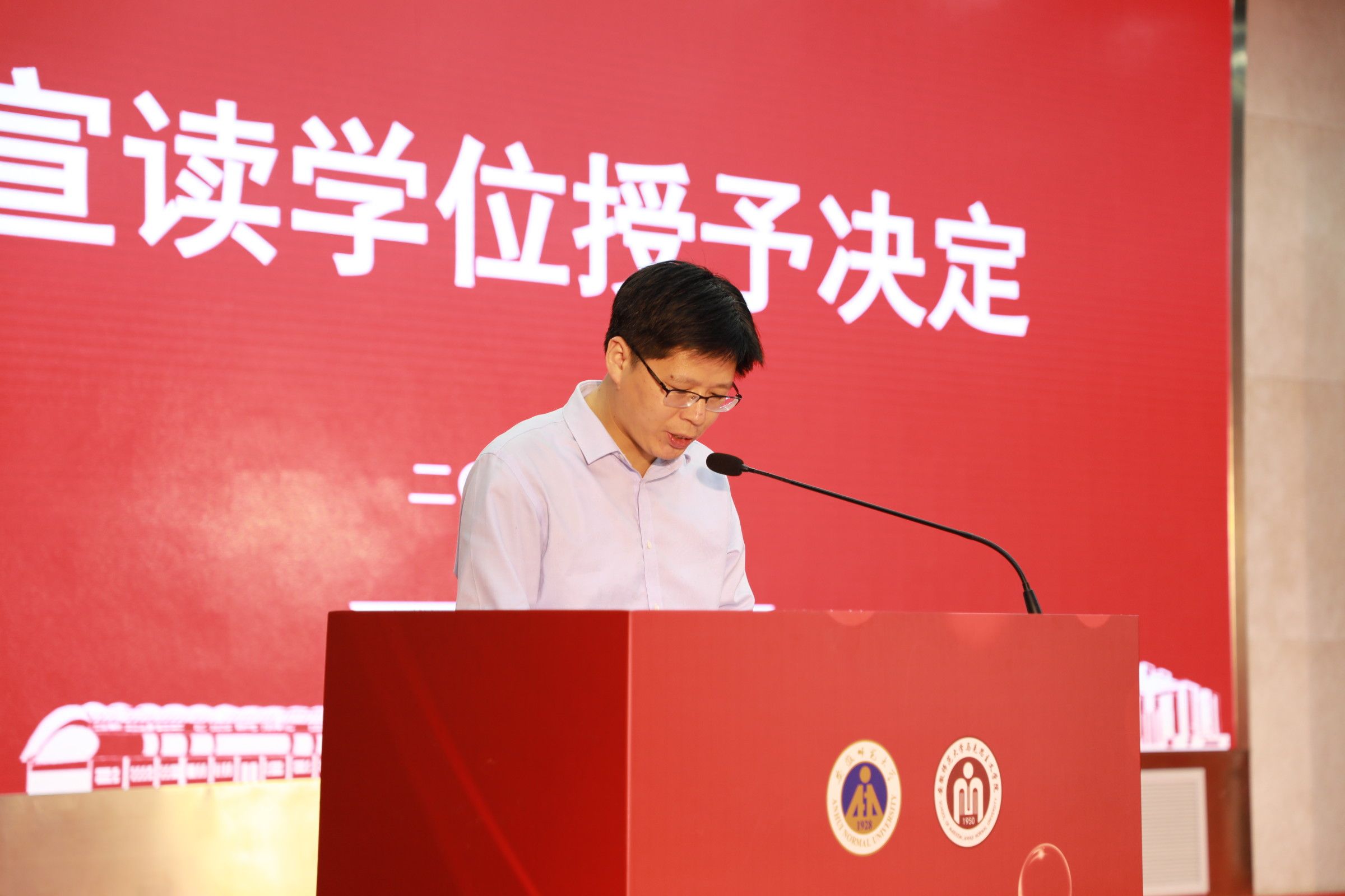 赵冰宣读了学士学位授予决定,校学位评定分委会成员为同学们颁发学位证书,员工依次上台领取,向老师们表达了感激之情。刘玉艳宣读聘任2023届毕业生员工联络员的决定,李祥兴为员工联络员颁发聘书。