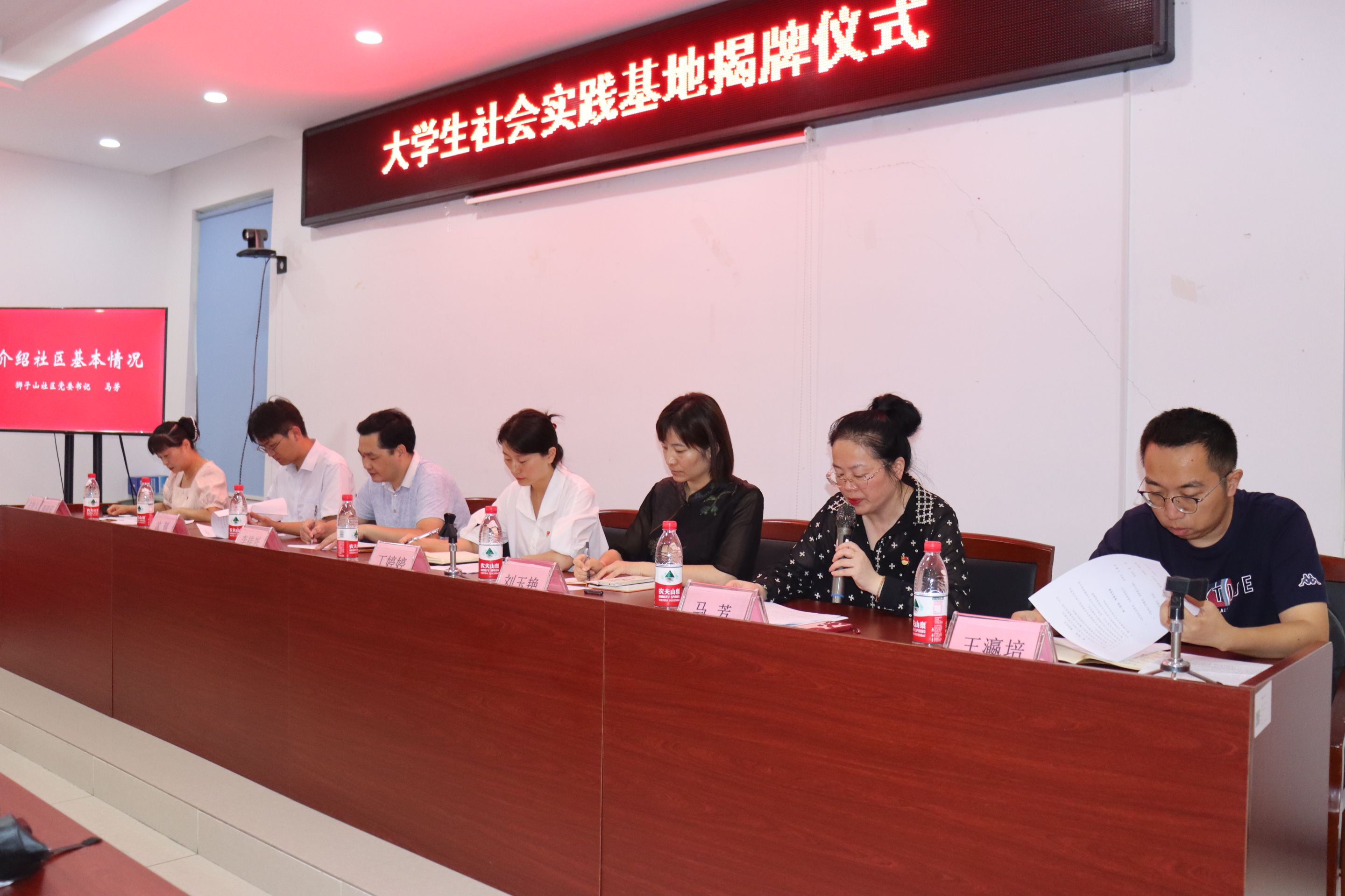 马芳对公司领导一行的到来表示热烈的欢迎,介绍了社区基本情况,王瀛培介绍了实践团队基本情况,员工代表王浩发言,刘玉艳与马芳签订共建协议,李祥兴与马芳一同为老员工社会实践基地揭牌式。
