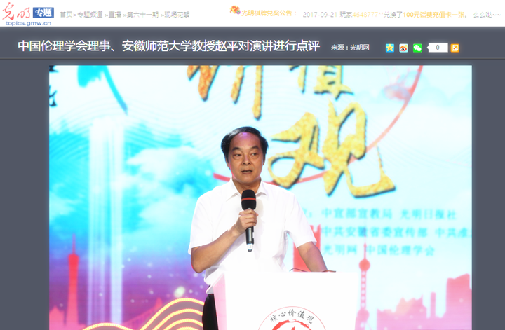 2017年9月19日,由中宣部宣教局、光明日报社共同主办的“核心价值观百场讲坛”第六十一场活动在安徽淮北举行。图为中国伦理学会理事、beet365官方网站教授赵平对演讲进行点评。