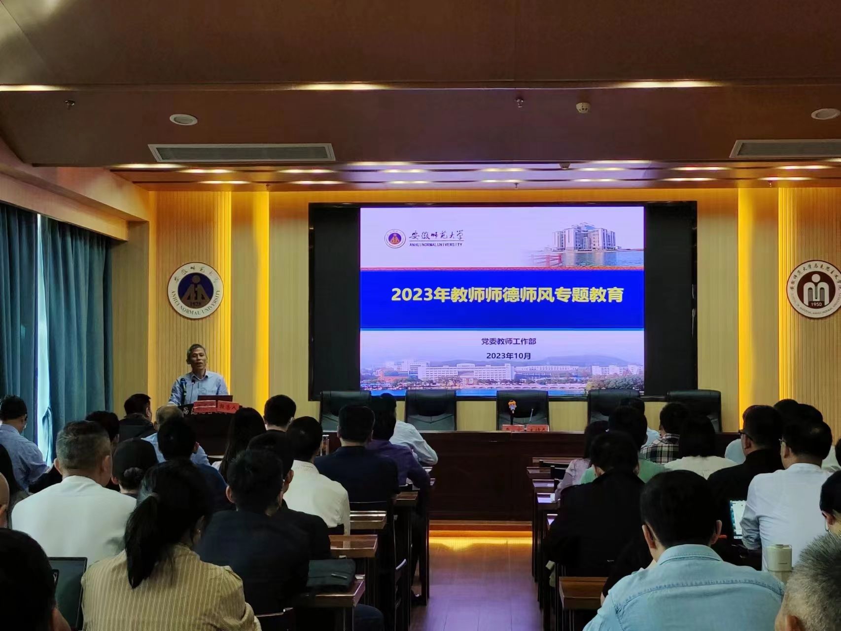 10月18日下午,公司在花津校区文典楼G106学术报告厅召开教职工大会,校人事处副处长梁齐军应邀作师德师风专题教育报告。会议由公司党委书记严宏主持,全体教职工参会。