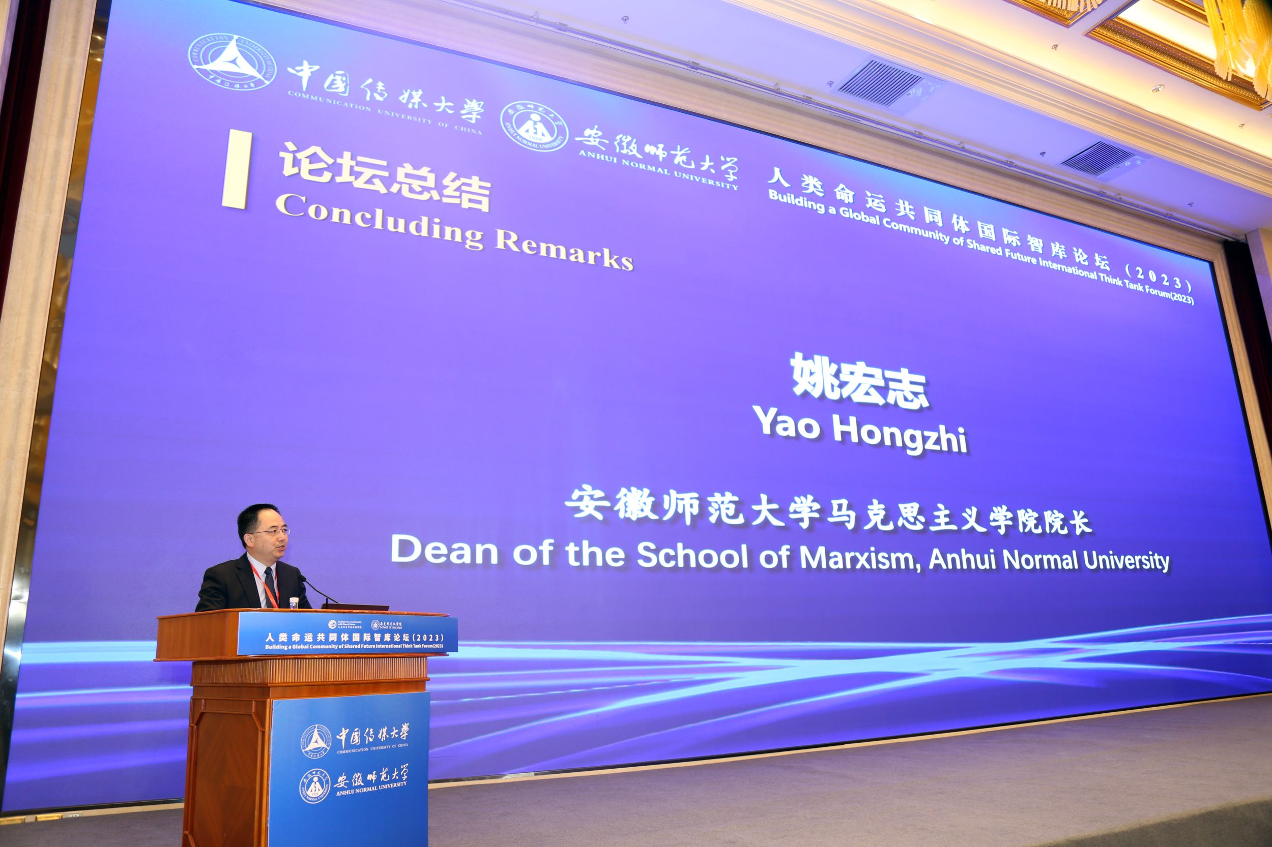 最后,姚宏志对论坛进行总结,他对与会领导、学者专家对本次“人类命运共同体国际智库论坛(2023)”的大力支持再次致以衷心的感谢。他在系统梳理大会嘉宾发言后表示,每位嘉宾专精于各自研究领域,并且热情地分享了宝贵的研究与观点,展现出了高超的学术水平和深厚的学术造诣,加深了对人类命运共同体问题的多方面认识和多层次思考。他指出,本次论坛上各位专家学者的精彩发言对人类命运共同体理念的研究与实践具有启发和激励作用,并期待未来与各人类命运共同体海外研究中心在学术交流、资源共享等方面开展深入合作。