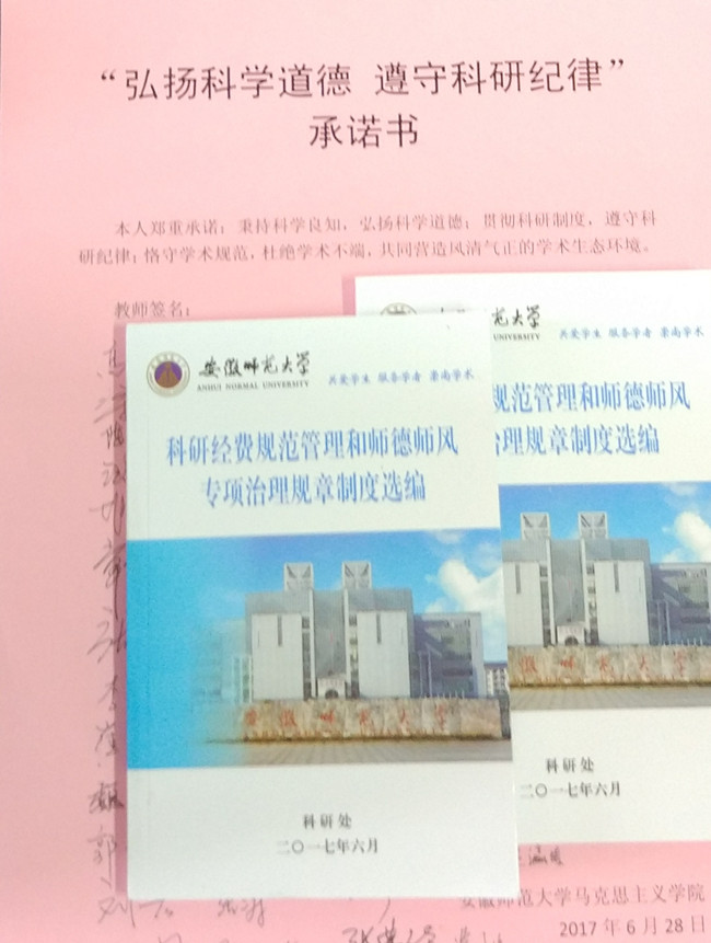 本次会议还开展了集体签名承诺活动,发放了《科研经费规范管理和师德师风专项治理规章制度选编》,通过内容和形式相结合的方式,激励广大教师学做结合,秉持科学精神,恪守学术规范。