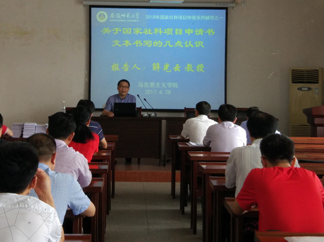 动员会上,历史与社会公司2017年国家社科重点项目获得者解光云教授为大家作了题为“关于国家社科项目申请书文本书写的几点认识”的辅导报告。他从理论和实例结合的维度,围绕课题设计、课题论证、核心观点和申请书填写四个方面进行了分析论述。他指出,课题设计要体现国家意志和时代关切;课题论证要有要点式表述和原典材料支撑,符合国标五点;核心观点即研究重点的学术表达,应力求体现高水平的理论素养;申请书则是以个人名义书写的国家社科发展史的文本资料,应求真务实,合法合规,对现实和历史负责。整场报告深入浅出,有理有据,不仅展示出解光云教授深厚的学术功底,而且拓宽了参会教师的申报视野,启发了申报思路,给人启迪。