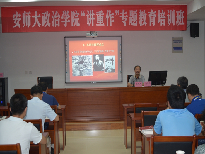 安徽省文史研究馆研究员、金寨红色研究会会长、金寨县人大常委会副主任副主任闫荣安作了题为《鄂豫皖革命根据地的光辉历程》的专题报告。闫荣安从鄂豫皖革命根据地的概况、鄂豫皖革命根据地的光辉历程以及鄂豫皖革命根据地的重要历史地位和深远意义等方面进行了阐释,通过大量珍贵详实的历史资料和幽默风趣的语言,讲述了革命先辈们在金寨这块“中国革命的重要策源地,人民军队的重要发源地”的红色热土上,为中国革命和建设所建立的丰功伟绩。