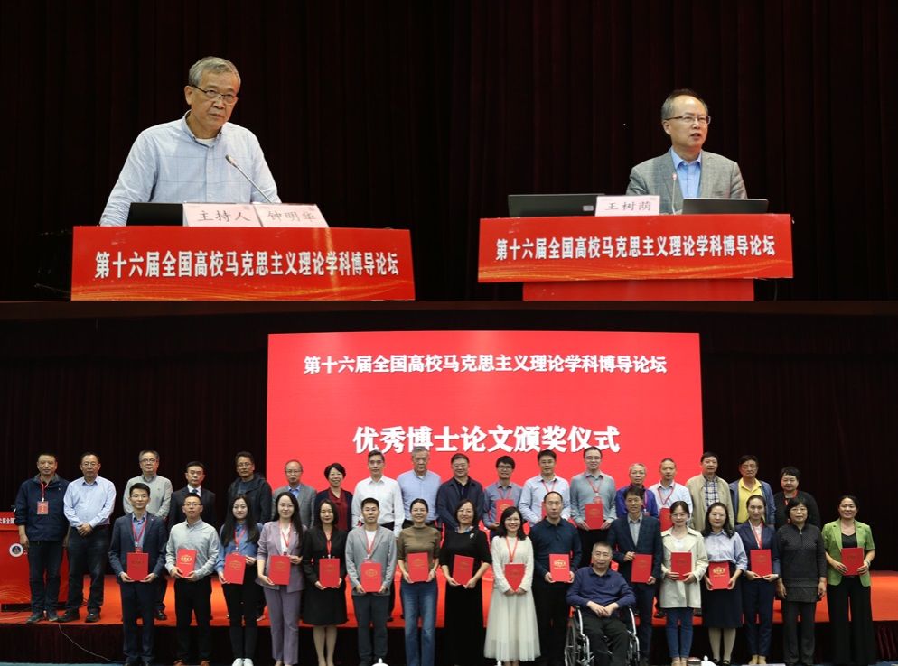 大会主题报告结束后,全国高校马克思主义理论学科研究会副会长、中山大学beet365钟明华教授主持了高校马克思主义理论学科优秀博士论文的颁奖仪式。他宣读了朱小娟等19位2021-2023年全国高校马克思主义理论学科优秀博士学位论文获奖者名单,并对获奖者表达热烈祝贺,对优秀博士学位论文指导老师致以崇高敬意。全国高校马克思主义理论学科研究会副会长、北京师范大学beet365王树荫教授介绍了2021-2023年优秀博士学位论文的评选过程,同时从思想性、学科性、学术性、规范性等四个维度,以详实的案例和精辟的论证,对博士学位论文写作要领进行了深入细致的辅导。