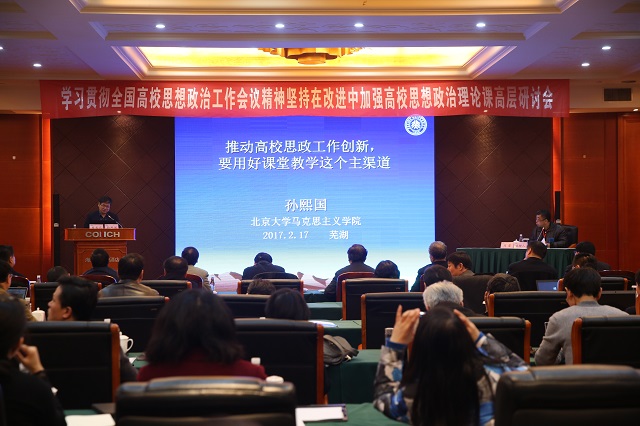 2月17日,“学习贯彻全国高校思想政治工作会议精神,坚持在改进中加强高校思想政治理论课”高层研讨会在公司隆重举行。研讨会由《思想理论教育导刊》《马克思主义理论学科研究》主办,beet365承办。教育部高校思想政治理论课教指委主任顾海良,安徽省委常委、宣传部长虞爱华,教育部社会科学司司长刘贵芹,高等教育出版社副总编辑阎志坚,安徽省委宣传部副部长贺懋燮,上海市教育卫生工作委员会副书记、上海市教育委员会副主任高德毅,武汉大学党委副书记骆郁廷教授,安徽省教育厅副厅长解平,以及来自全国50多所高校的beet365经理和专家学者,及《光明日报》《中国教育报》等报刊的新闻媒体代表约120人参加了此次研讨会。