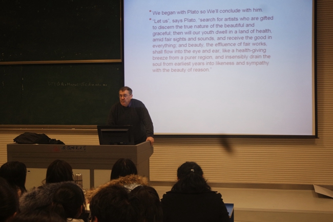 Brian Mooney教授首先用“美是主观的还是客观的?”这一问题作为导入,引起了同学们广泛的讨论。接着,教授通过几张不同风格的男女图片,向同学们揭示出不同的人眼中有不同的美,同一种事物由于状态不同,所呈现的美也会有所不同,由此引起了同学们的共鸣。之后,Brian Mooney教授借用很多具体的美的事物逐步引申出柏拉图所说的“美”的理念,向同学们阐明“Beauty”作为一种理念是独立于具体的美的显现。通过列举孩童的涂鸦、莎士比亚的戏剧作品等事例,Brian Mooney教授强调出美是客观存在的。不仅如此,教授还通过自身经历说明每个人由于物质状况、文化条件的不同,因而对美的欣赏能力会有所差异,但美的本性是一致的,感受美的程度不同是因为很多其他的附加价值。最后,在与同学们的互动交流过程中,Brian Mooney教授鼓励大家在日后的课堂学习中可以多提问,大胆地说出自己心中的想法,在不断讨论的过程中追求智慧。