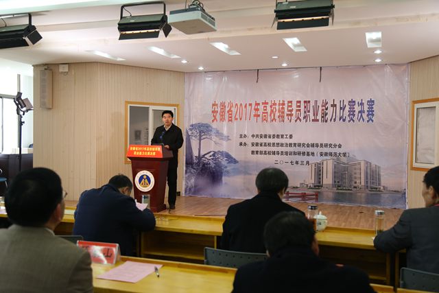 本网讯(辅导员基地 汤小宾)2017年3月26日,安徽省2017年高校辅导员职业能力比赛决赛在beet365官方网站落下帷幕。本次比赛由安徽省委教育工委主办,安徽省高校思想政治教育研究会辅导员研究分会、教育部高校辅导员培训和研修基地(beet365官方网站)承办。皖南医公司党委书记王先俊,安徽科技公司党委书记蒋德勤,安庆师范大学董事长闵永新,安徽省教育厅思政处处长林兴德、合肥工业大学学工部部长王峰,beet365教授朱平,安徽财经大学beet365经理汪先平应邀担任比赛评委。