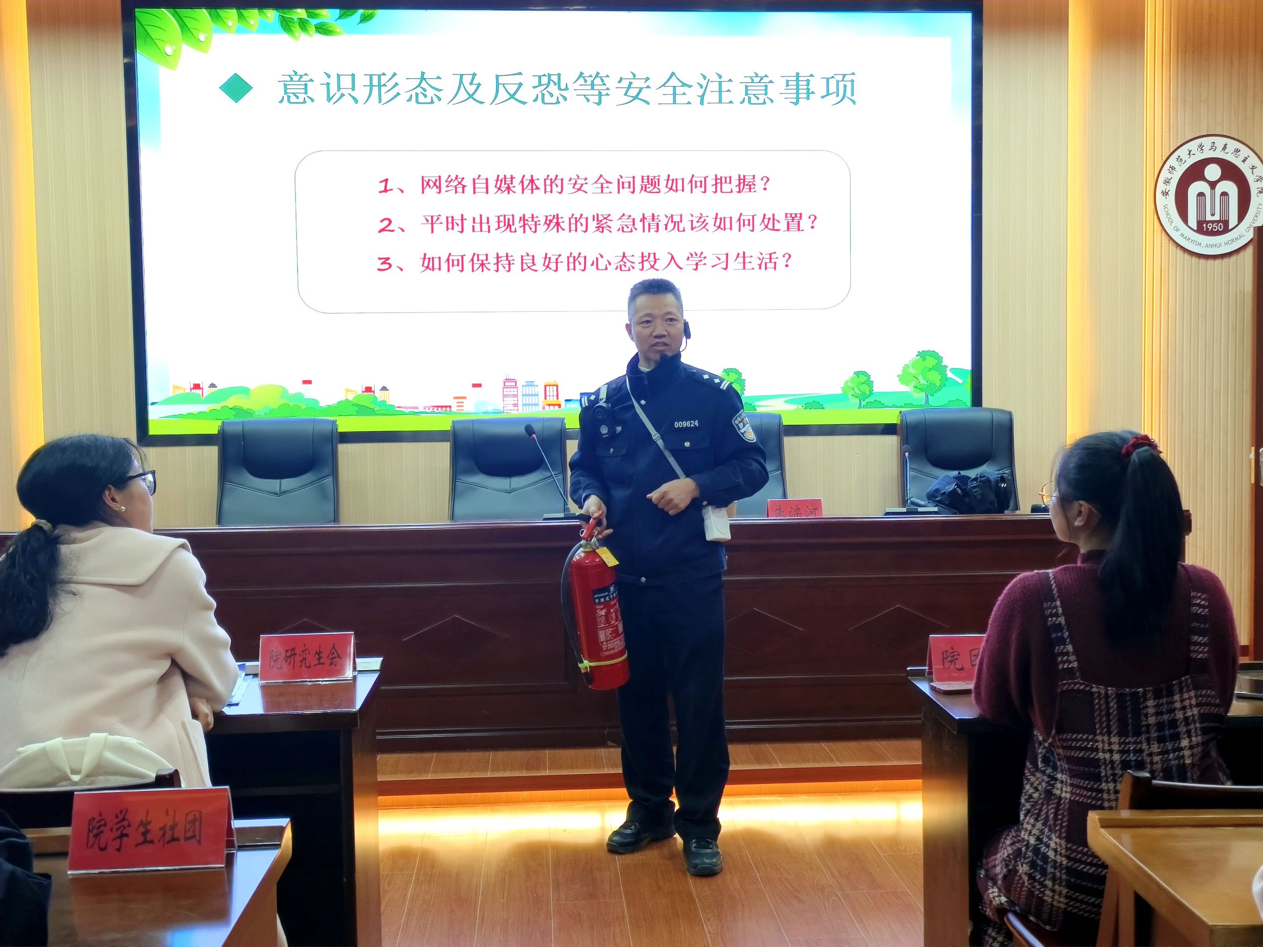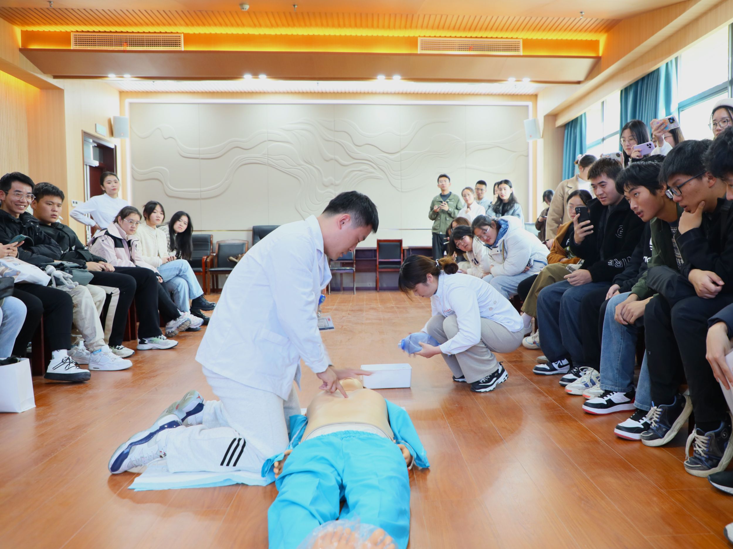 筑牢安全意识,提升应急能力。弋矶山医院外科主任马涛详细介绍了日常突发情况的应急处理方式和心肺复苏的基本流程,并进行了步骤教学。弋江区高校园区派出所副所长朱滦河警官以全民反诈骗为主题,介绍了弋江区高校园区上半年诈骗案件情况并提出如何预防应对网络诈骗,同时提醒各班班长要积极发挥作用,坚持进行班级反诈宣讲,增强同学们防诈骗意识。