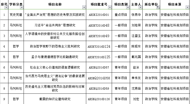 近日,安徽省社科规划办发布了《关于下发2016年度安徽省哲学社会科学规划项目立项通知书的通知》,我院共有9项课题获立项资助,包括重点项目1项、一般项目4项、青年项目4项。这是我院历年来获省社科规划项目立项总数最多的一次,占全校立项总数的24%,充分展现了我院人文社会科学研究的良好态势和深厚的发展潜力。