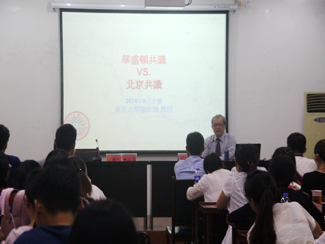 谢教授的报告围绕“华盛顿共识VS北京共识”这一主题,以挑战与回应模式、帝国主义模式、传统与现代模式、中国中心模式四种模式为切入点,对一百年来中国发展模式的理论探讨进行了深入解读,剖析了华盛顿共识与北京共识的特点,抛出了华盛顿共识是否要走北京共识的道路这一问题供大家思考。谢教授的讲解深入浅出、风趣幽默,赢得了现场师生的阵阵掌声,期间穿插了许多对于大陆和台湾在发展模式、发展方向上的独到见解,开拓了同学们的视野。