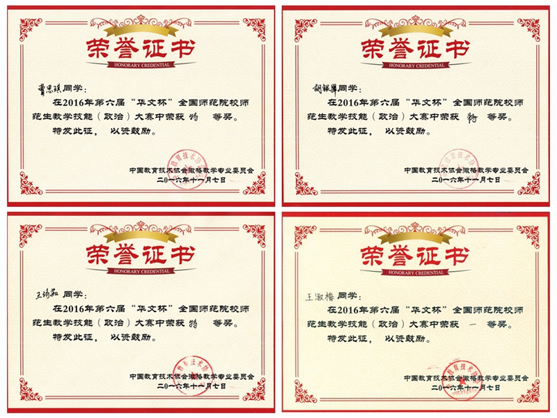 本网讯11月4日至8日,学院五名本科生在指导教师陶永华和戴家芳带领下,赴贵州省铜仁市参加第六届“华文杯”全国师范院校师范生教学技能大赛并取得了优异成绩,斩获了教学技能比赛三个特等奖、两个一等奖,充分展示了政教学子较深的理论功底和扎实的教学专业技能。
