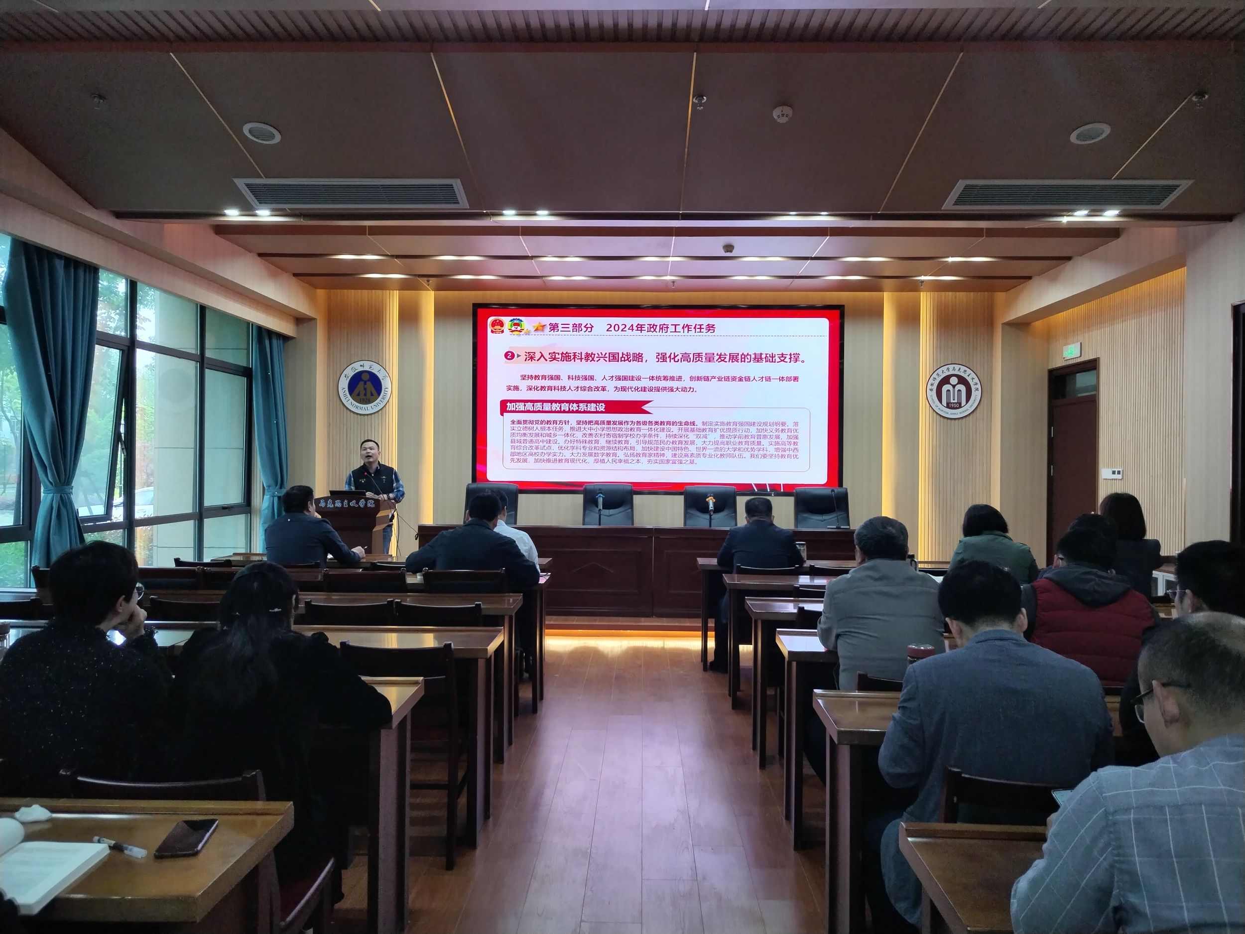 会上,张鑫副教授作《学习两会精神,牢记使命担当——2024年全国“两会”政府工作报告精神解读》专题辅导报告。他从2023年政府工作内容回顾、2024年经济社会发展总体要求和政策取向及政府工作内容三个方面全面梳理了“两会”政府工作报告,结合我国经济社会发展情况对两会精神进行解读。