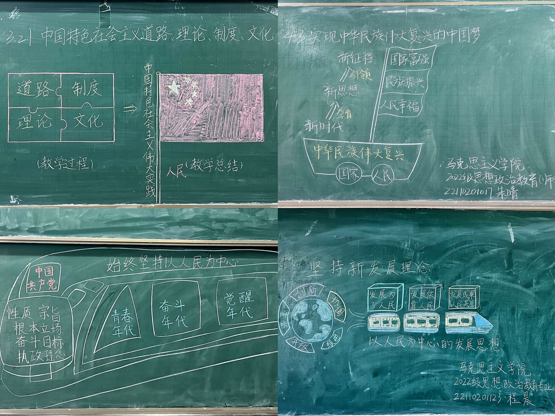 教学板书,绘知识脉络。178份板书作品均属于高中政治课程内容范围,知识和美感并重。《实现中华民族伟大复兴的中国梦》的板书整体以宏伟的船形图案呈现,三节风帆分别对应三个中国梦的本质;《推动高质量发展》的板书以“新能源汽车”为主体形状,将新发展理念、高质量发展与建设现代化产业体系的内容融合,兼具逻辑性与设计感。