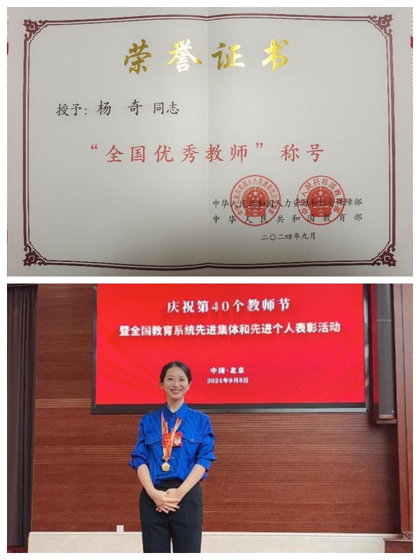 杨奇老师出生于教师家庭,70年前,她的祖母作为新中国第一批进京受训的教师,曾受到蔡畅、康克清等同志的亲切接见;她的姑姑扎根讲台30年,获评“安徽省优秀教师”等荣誉称号。作为一名教育战线上的追梦人,杨奇老师一直秉持着、践行着祖辈们的教诲。在铜陵三中任教以来,她坚定为党育人、为国育才的初心使命。走访每一个家庭,为员工建立“成长档案”,利用家长、公司、社会资源建设“家校共育场”;以兴趣和素养为出发点,带领员工成立合作学习小组,共建“自主学习场”;以立德树人为根本点,开展多种形式的“青春班会”“团课晨会”,在知行合一中讲好新时代思政课,打造“大思政育人场”。工作后曾获安徽省优秀教师、安徽省优秀青年教师、安徽省“特支计划”教学名师、安徽省“教坛新星”等称号。