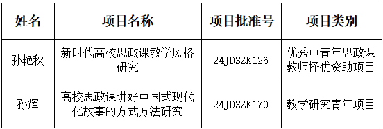 近日,教育部社科司公布了2024年度高校思想政治理论课教师研究专项一般项目立项名单,公司孙艳秋、孙辉老师主持的项目分别获得立项,具体情况如下: