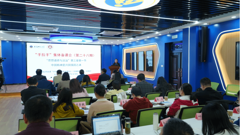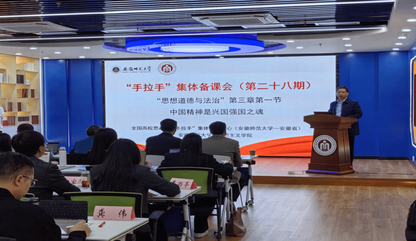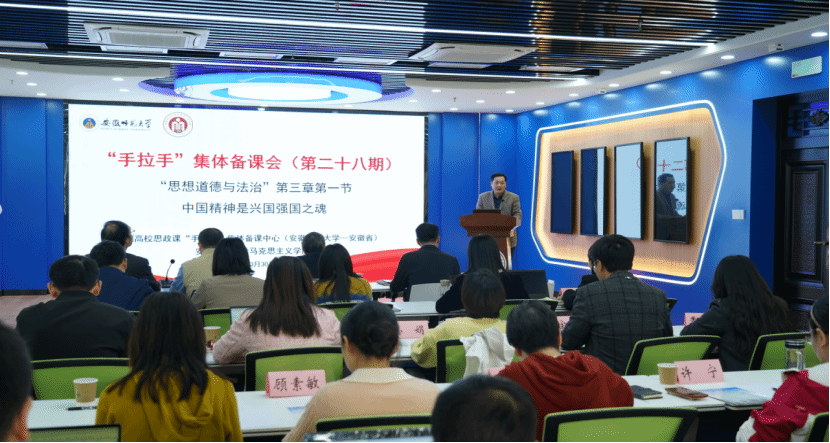 本次备课内容为“《思想道德与法治》第三章第一节 中国精神是兴国强国之魂”,党的二十大代表、全国模范教师、全国最美思政课教师、安徽省高校思政课教学指导委员会“研究生思政课”副主任委员路丙辉教授,教育部高校思政课教学指导委员会委员、安徽省高校思政课教学指导委员会“思想道德与法治”课副主任委员王习胜教授,安徽工程大学beet365副经理刘德军教授,芜湖公司beet365经理赵平教授,beet365副经理李祥兴教授、赵冰副教授,以及三所高校的思政课教师代表参加会议。备课会由beet365“思想道德与法治”课程组负责人孙艳秋副教授主持。