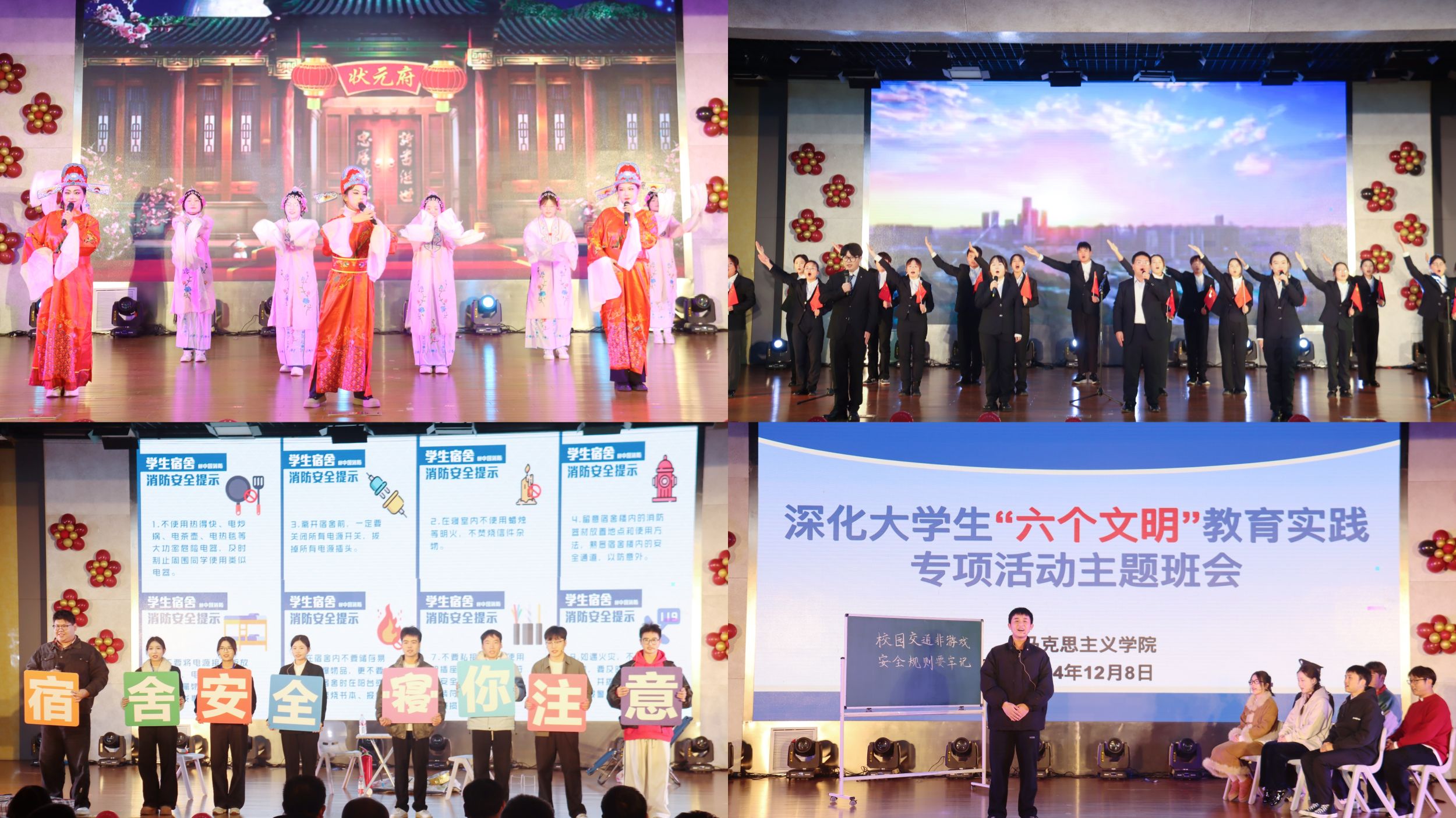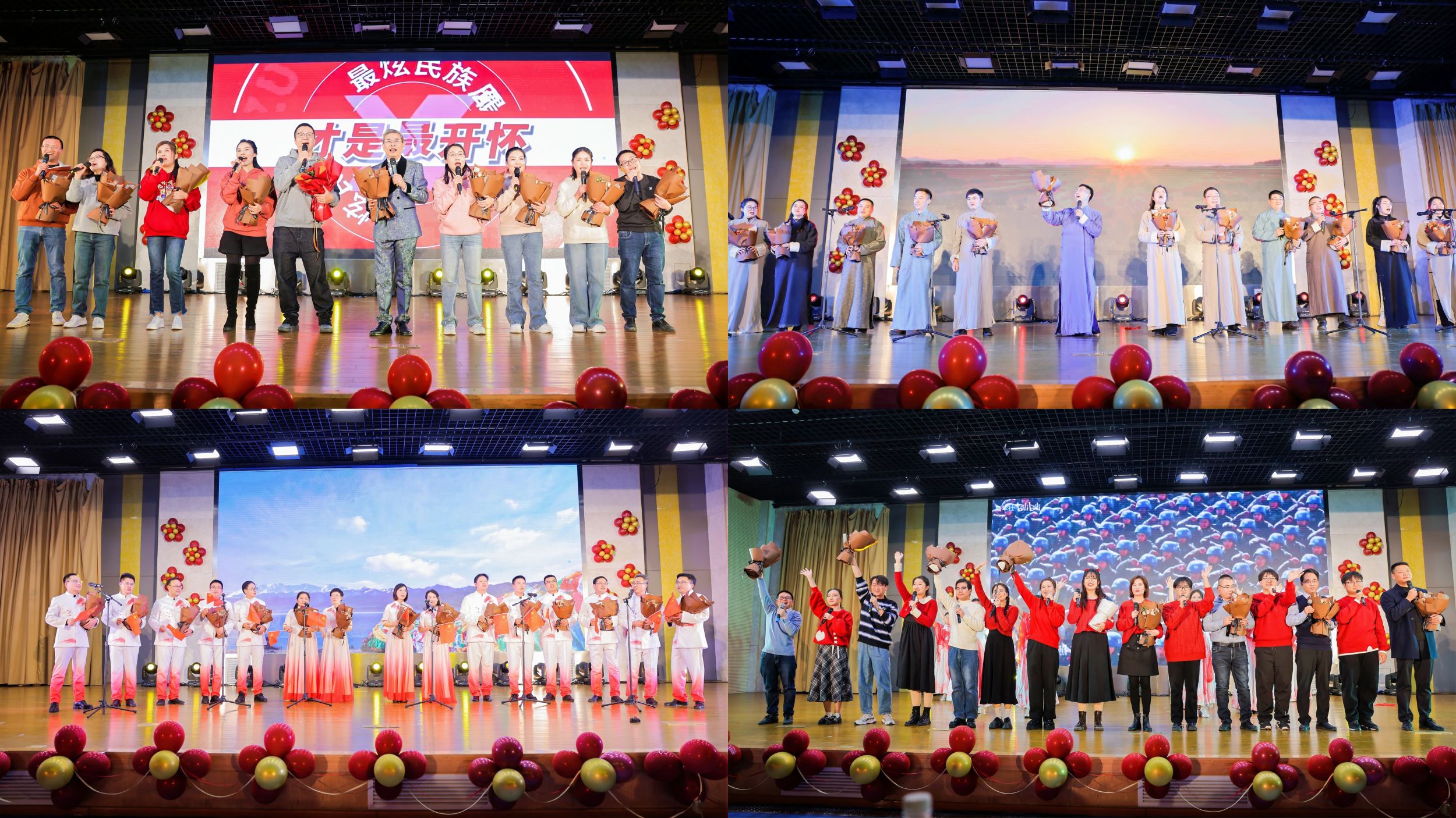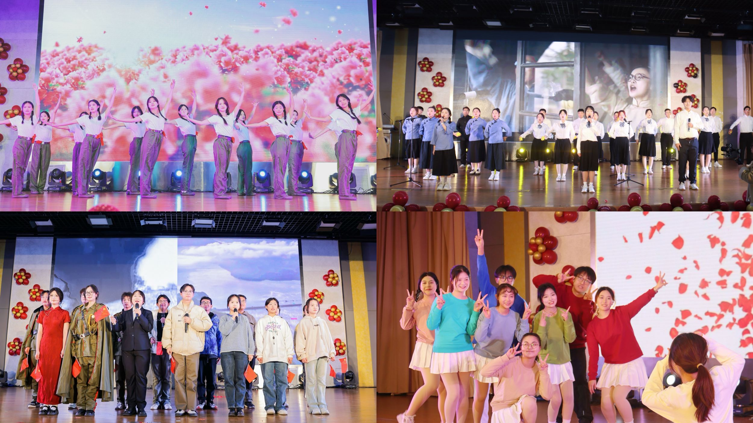 开场舞《我的未来式》用充满青春活力的舞姿点燃现场气氛。教工节目《天路》《沧海一声笑》《大中国》掌声不断,瞬间拉进了师生的距离。戏曲《黄梅戏韵,六尺巷情》、敦煌舞《沁莲》独具特色的表演令人赞叹。合唱《错位时空五四版》、歌伴舞《绒花》、朗诵《七十五载雄浑,巍巍中华》、情景剧《风华》诉不尽对祖国的深深热爱。小品《宿舍风波》《时光“倒带”之安全启示》演员生动演绎,在带来欢笑的同时引人深思。结束曲《我们一起远航》歌声嘹亮,充满希望。师生同台献艺,精彩的演出,拼搏的氛围共同呈现了红色beet365的精彩盛宴。