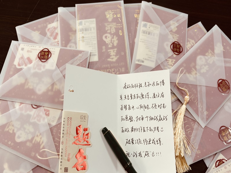 公司贴心地为每位考研学子准备了一份寓意深刻的“上岸加油包”,包括手写祝福的贺卡、印有“一路生花 成功上岸”的全套考试文具大礼包、“苹”稳上岸、一战“橙”硕的祝福水果、增添好运的旺仔牛奶和零食补给,为每一位同学们送上最诚挚的祝福,增强冲刺备考的信心和底气。
